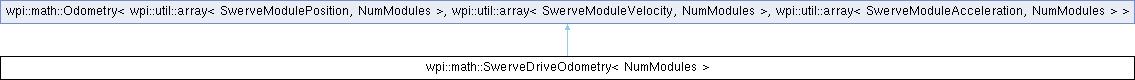 | Public Member Functions inherited from wpi::math::Odometry< wpi::util::array< SwerveModulePosition, NumModules >, wpi::util::array< SwerveModuleVelocity, NumModules >, wpi::util::array< SwerveModuleAcceleration, NumModules > > | |