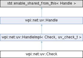 | Public Member Functions inherited from wpi::net::uv::HandleImpl< Check, uv_check_t > | |