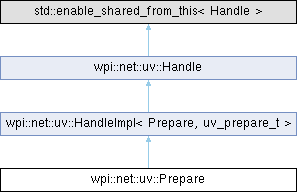 | Public Member Functions inherited from wpi::net::uv::HandleImpl< Prepare, uv_prepare_t > | |