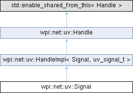 | Public Member Functions inherited from wpi::net::uv::HandleImpl< Signal, uv_signal_t > | |