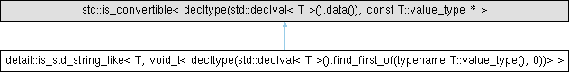 Inheritance diagram for detail::is_std_string_like< T, void_t< decltype(std::declval< T >().find_first_of(typename T::value_type(), 0))> >: